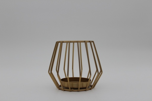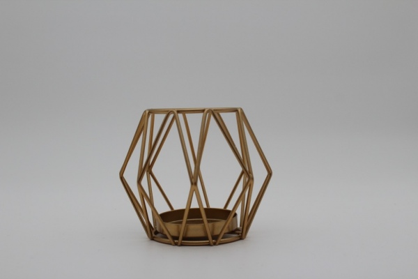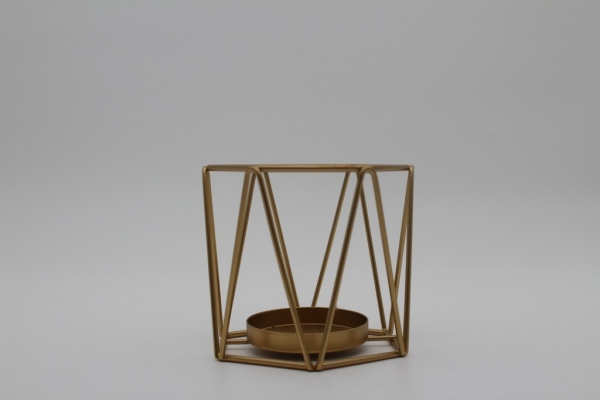 Moderner geometrischer Teelichthalter. Der Teelichthalter besteht aus einem goldfarbenen Metallrahmen. In der Mitte befindet sich eine runde Halterung, die Platz für ein Teelicht bietet. In drei verschiedenen Variationen erhältlich.
